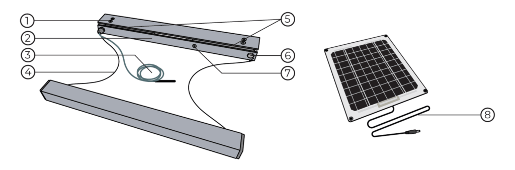 De aluminium behuizing is het deel waarop een bijenkast wordt geplaatst. Het eerste aluminium deel bevat een elektronica box en de gewichtssensoren. In de elektronica box is op maat gemaakte elektronica geïnstalleerd, waarmee de monitor gegevens van verschillende sensoren kan ophalen (zoals de buiten temperatuur- en relatieve vochtigheid) en versturen naar de Cloud. De afstandsdraden tussen de 2 aluminium balken worden gebruikt om de balken gemakkelijk op gelijke afstand van elkaar te plaatsen voor de bijenkast. Ook bevat deze een zonnepaneel-connector, zodat het mogelijk is om een zonnepaneel aan te sluiten. Het zonnepaneel laadt de batterij op van het systeem, zodat deze autonoom kan werken. Met een druk op de AAN/UIT schakelaar springt het systeem aan en kan jij aan de slag!